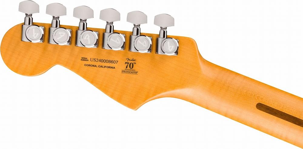 ポップインアーム付き2点支持American Ultraシンクロナイズドトレモロ、ポリッシュ仕上げのステンレスブロックサドル、コールドロールドスチールブロック、デラックスロッキングチューニングマシン、ソフトタッチノブ、1-plyアノダイズドピックガードなど、高い実用性を誇る機能を搭載しています。