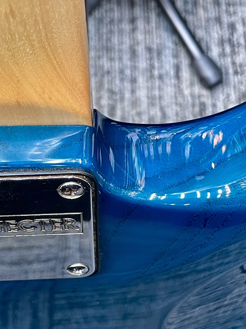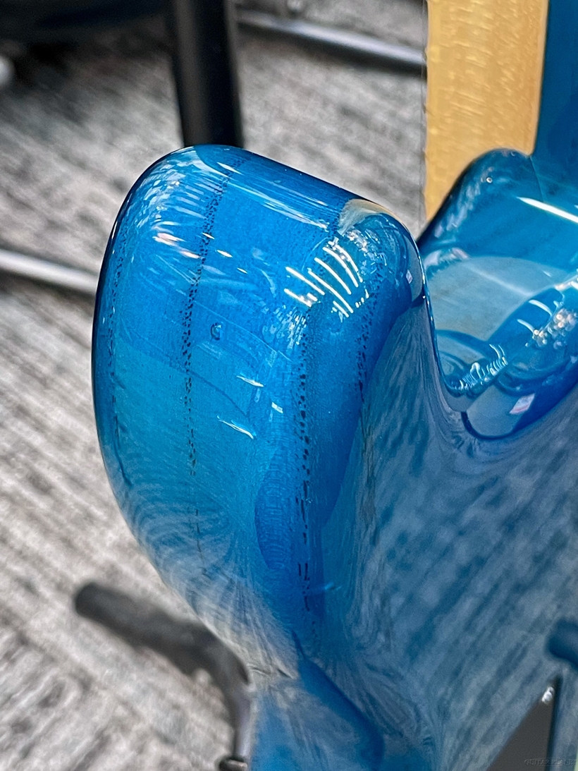大ぶりの4Aグレードキルトメイプルの杢目がまるで虎柄の様に走り、深いターコイズ系のBlack Aquaが濃淡を際立たせる、高級感溢れる上位モデルらしいルックスです。