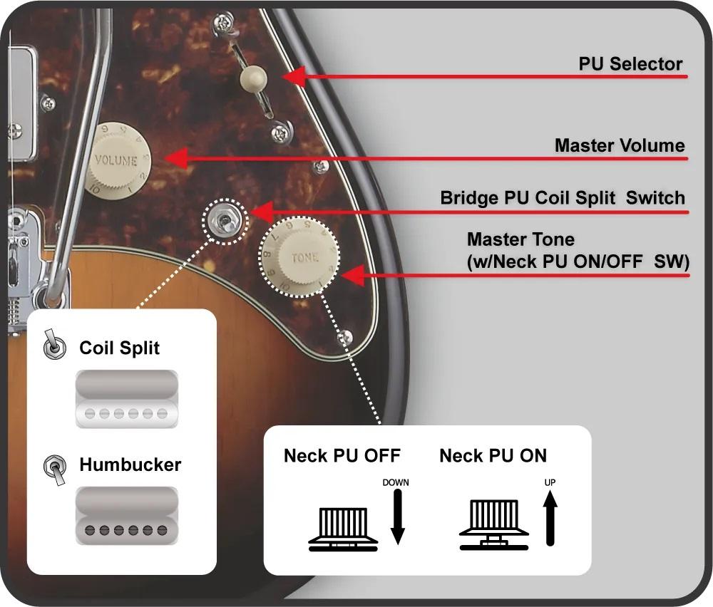 コントロール:Master Volume, Master Tone (Neck PU ON/OFF SW), 5-Way Lever PU Selector, Bridge PU Coil Split Switch