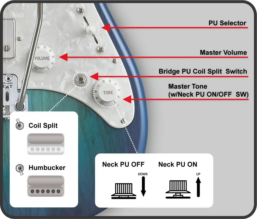 コントロール:Master Volume, Master Tone (Neck PU ON/OFF SW), 5-Way Lever PU Selector, Bridge PU Coil Split Switch