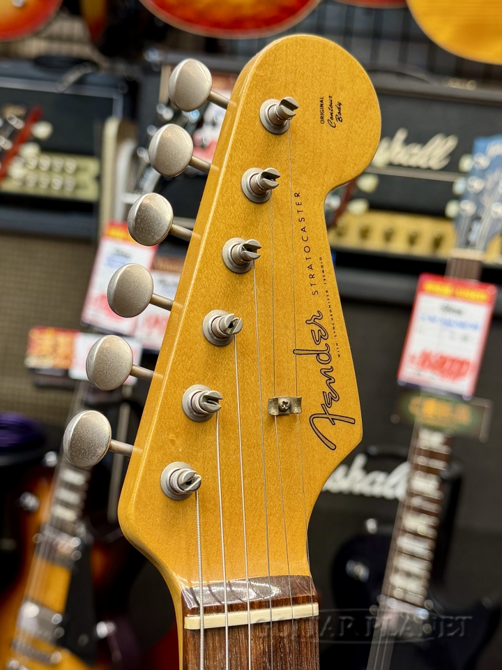 1962年スタイルのストラトキャスターの特徴である「スラブ貼りローズウッド指板」「11点止め3プライ・ピックガード」を再現しています。
