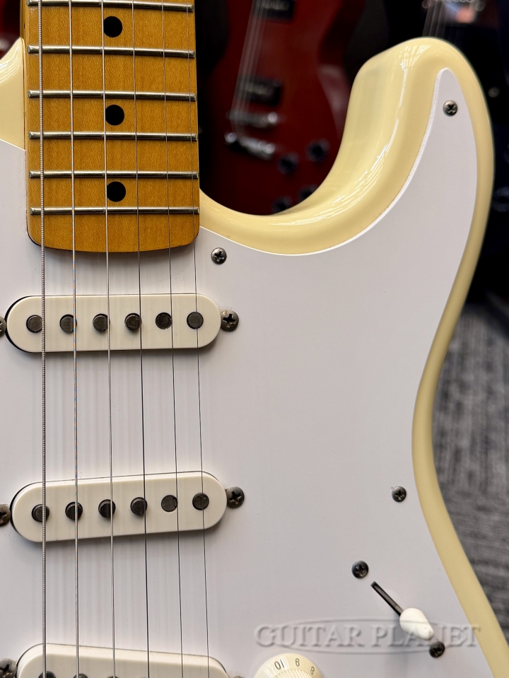 1957年スタイルのストラトキャスターの特徴である「メイプル1ピースネック」「8点止め1プライ・ピックガード」を再現しています。