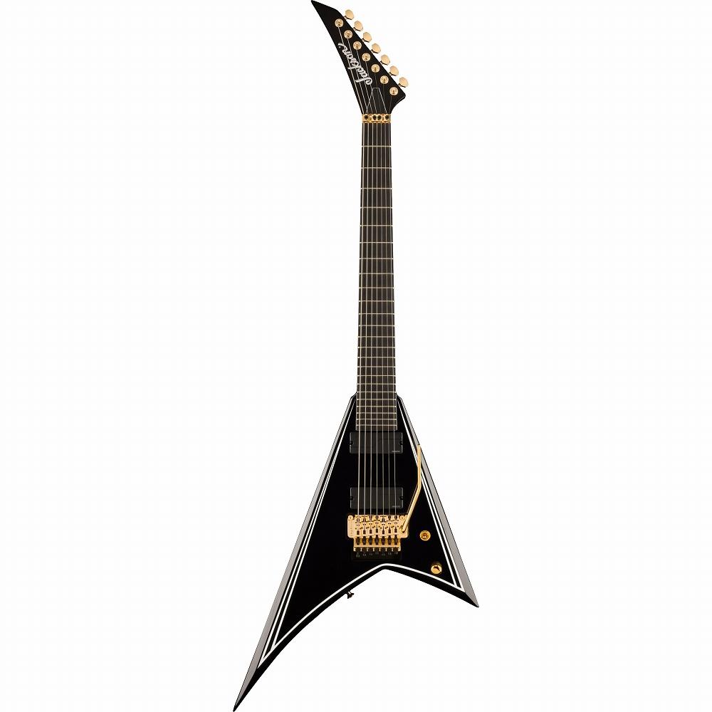 Jackson Pro Signature Mark Heylmun RR24-7は、Gloss Blackフィニッシュにホワイトピンストライプ、7連ペグ式リバースポコンコルドブラックヘッドストック、ゴールドハードウェアを備え、ステージ上で大胆な魅力を解き放ちます。