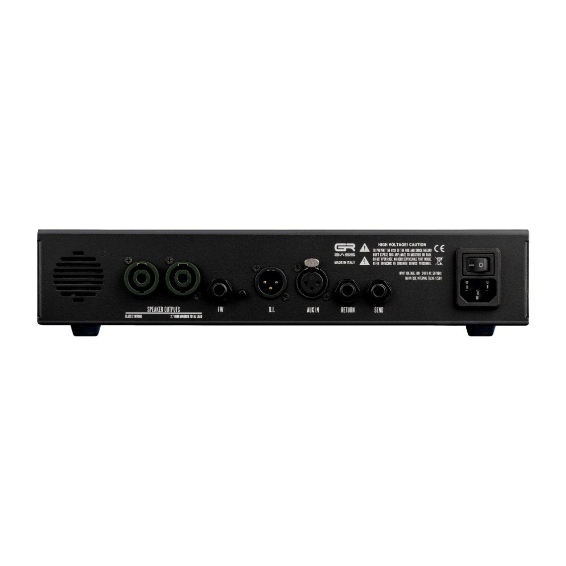 リアパネル:Speakers Output x2 (Speakon Combo 2.7 ohm minimum), Footswitch (For Drive and Mute), GND LIFT Button, D.I. Output (XLR), AUX IN (XLR), Effects Loop (SEND / RETURN), AC Input