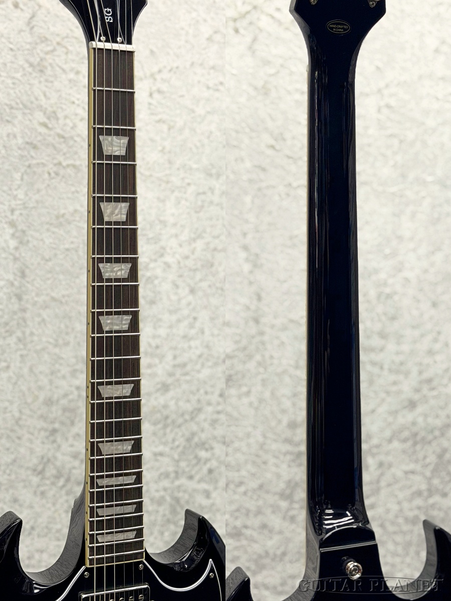 セットネック方式でジョイントされたネックはSGの高いサスティン特性に寄与しています。ネックシェイプはスリム・テーパー Cプロファイルが採用され、素早い滑らかなフィンガリングを可能にしています。ミディアム・ジャンボ・フレットが打たれたローレル指板にはパーロイド素材のディッシュ・インレイが施され、12インチの指板R(ラディアス)採用によりロー・ポジションでのコード・プレイやハイ・ポジションでのベンディングの両方をストレスのない演奏が可能です。