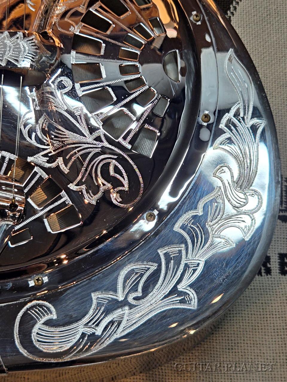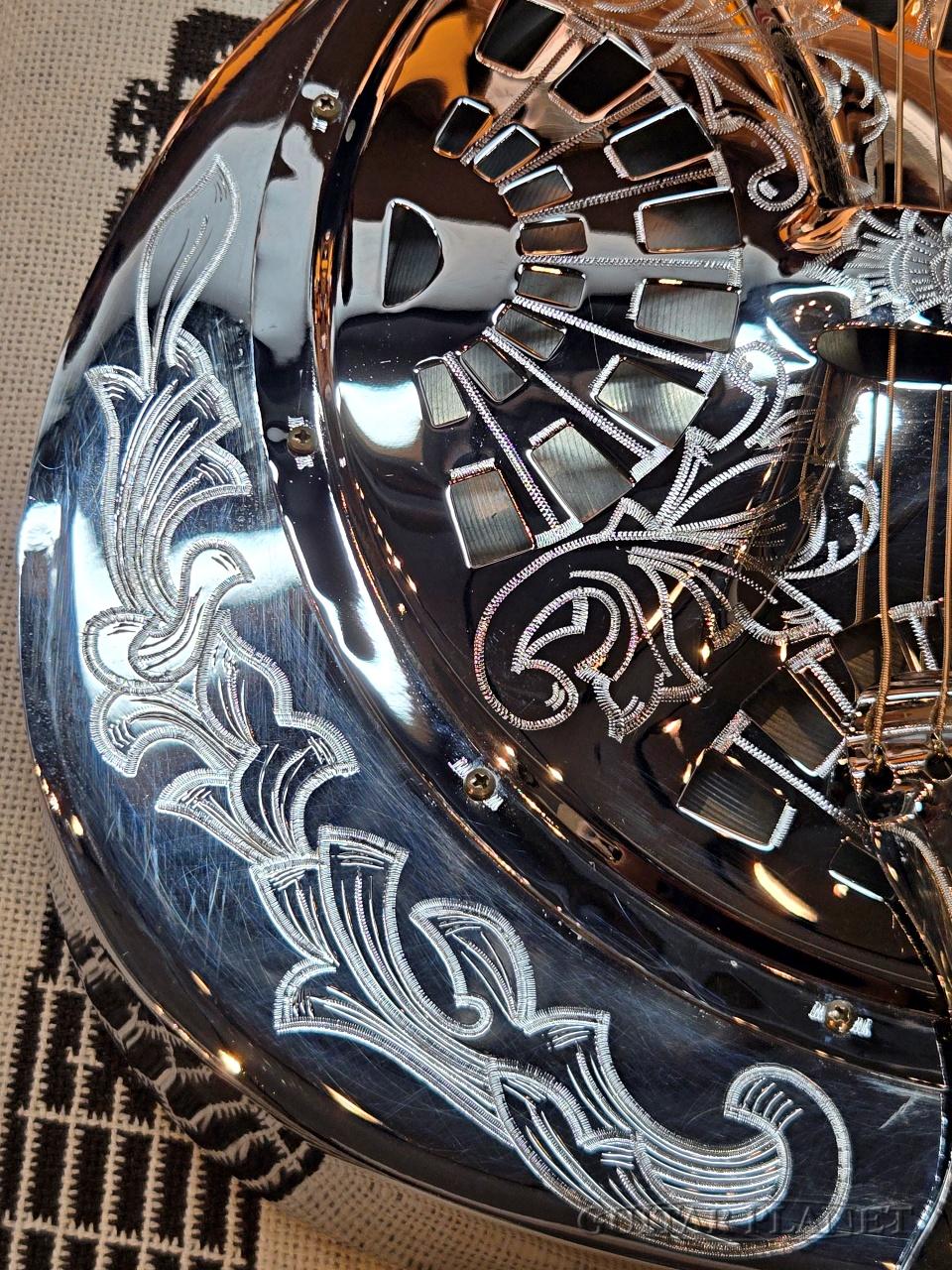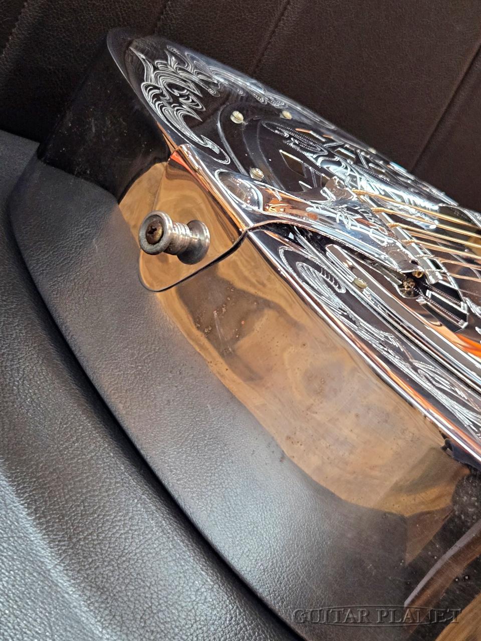 シールド(盾)モチーフの装飾が随所にあしらわれており、リゾネーターらしい“見せる楽器”としての魅力を存分に感じさせるルックスに仕上げられています。
