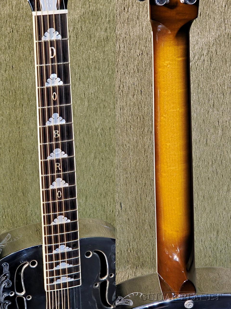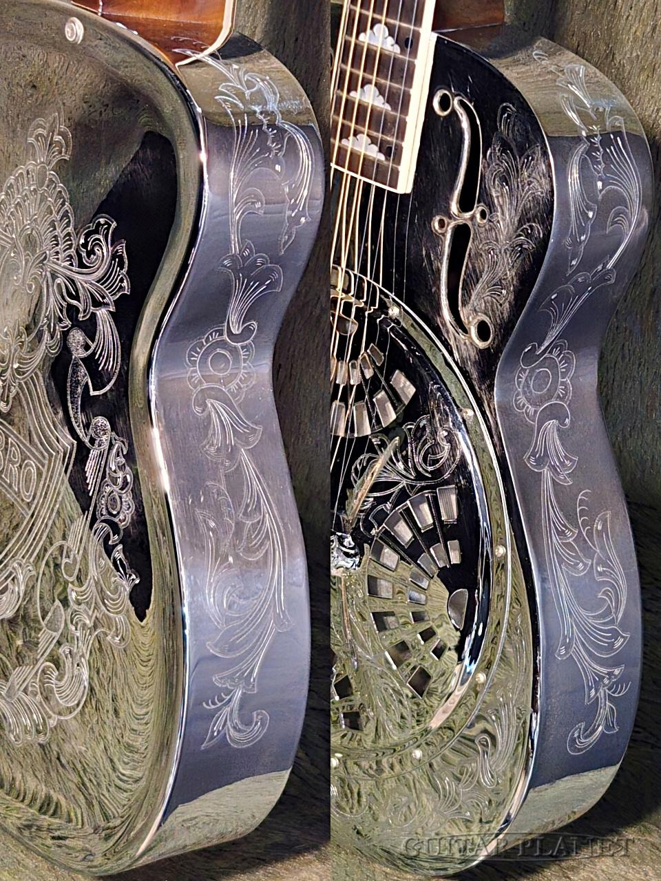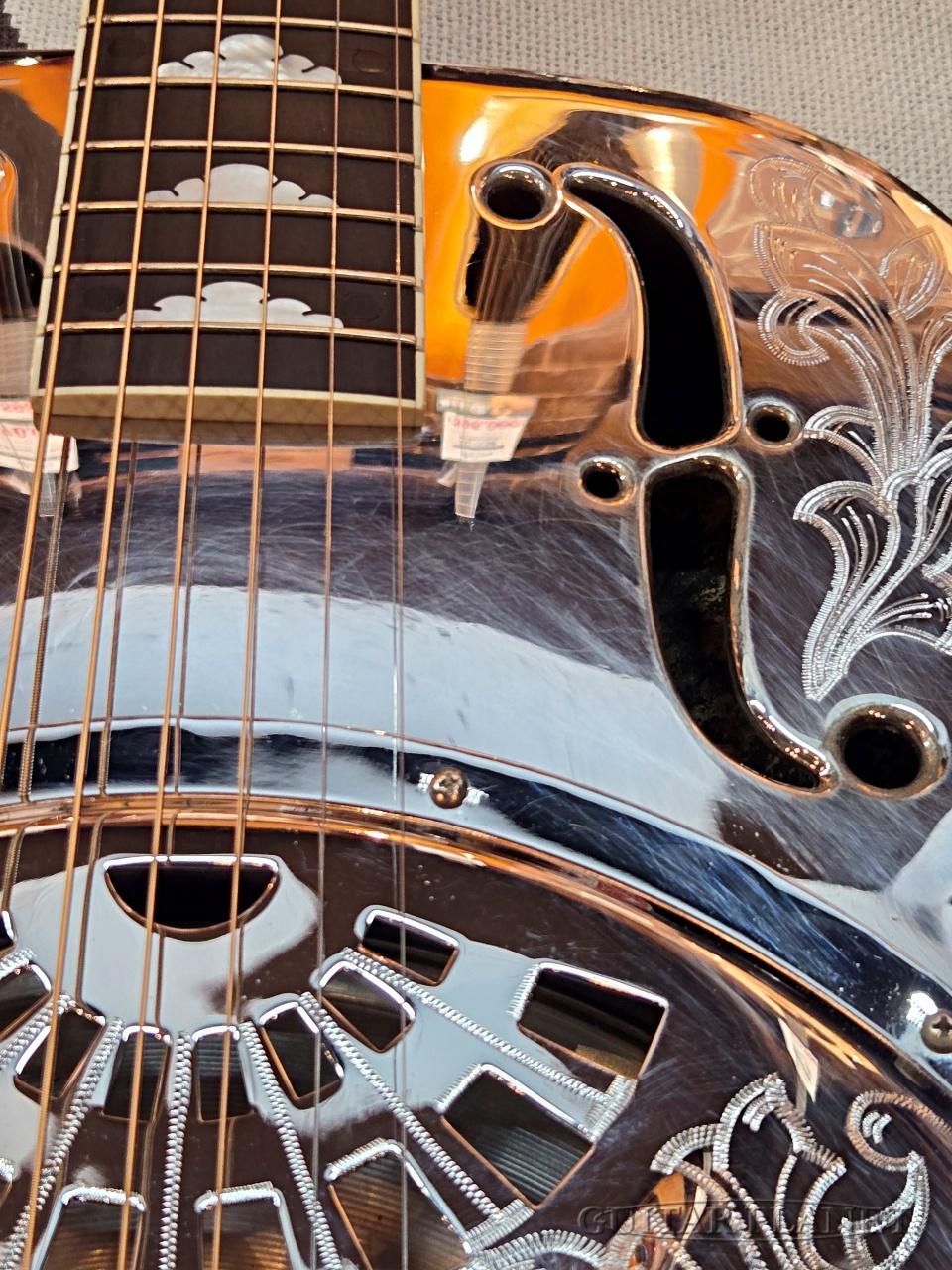シールド(盾)モチーフの装飾が随所にあしらわれており、リゾネーターらしい“見せる楽器”としての魅力を存分に感じさせるルックスに仕上げられています。
