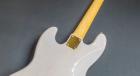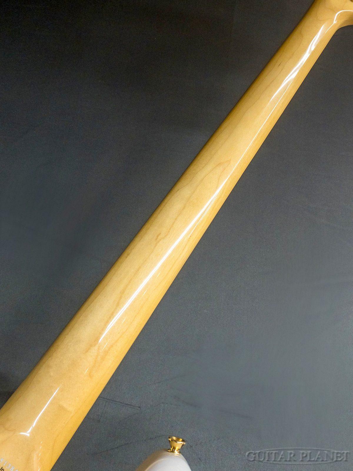 カラーラインナップや追加可能なオプションが多いのも特徴で、この個体はシースルーホワイトにゴールドパーツを組み合わせた洗練されたルックスです。ボディの木材はアルダーですが比較的木目がよく出ている材をチョイスしており、シースルーとの相性抜群、作り手が操作できない自然物ならではのランダム性により、世界に1本だけしかない見た目の個体になりました。