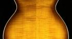この度入荷致しました「AM153FM」は、AM ARTSTARシリーズ最上位モデルで、14.5インチ幅フレイム・メイプルトップ、メイプルサイド&バックのボディに、マッカーサー・エボニー指板を貼り合わせたナトーとメイプルから成る3ピースネックがセットネック構造にてジョイントされております。(17フレットジョイント、22フレット仕様、ミディアムスケール採用)