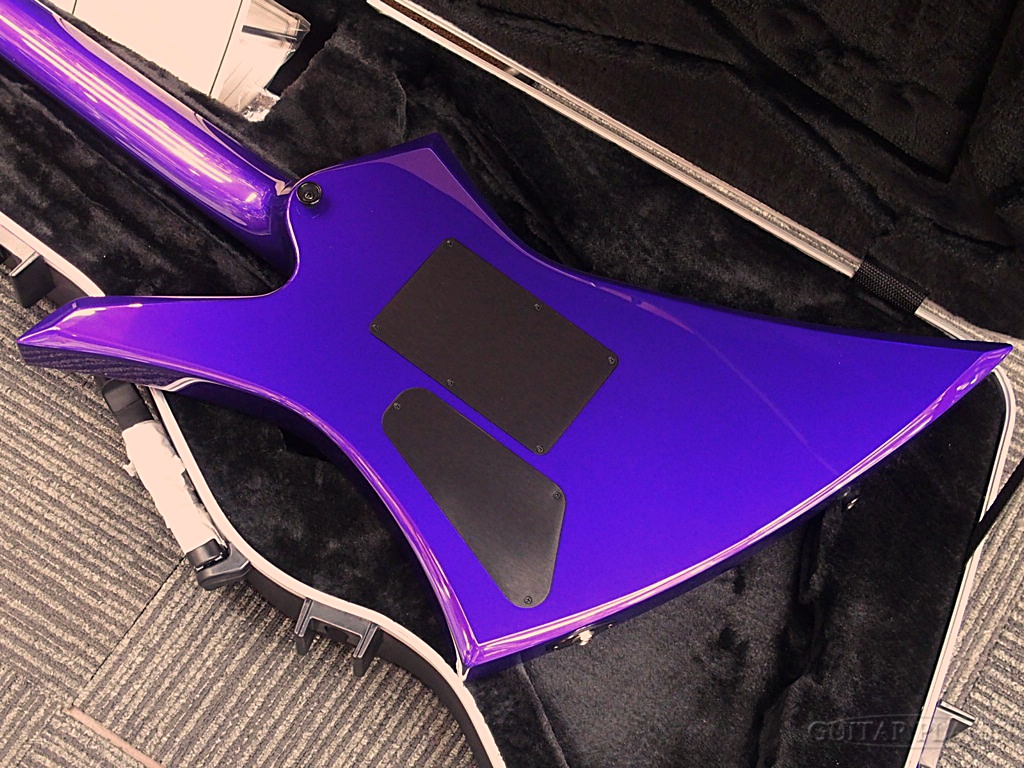しかし、こちらのシェイプが最も知名度を上げたのはMEGADETH在籍時のMarty Friedmanによる使用ではないでしょうか。彼の使用モデルは1ハムバッカーピックアップにノントレモロ、1ヴォリュームのシンプルな仕様でしたが、こちらのモデルは、2ハムバッカーピックアップ、Floyd Roseトレモロ、1ヴォリューム、1トーンのより汎用性に優れ、派手なパープルメタリックでオーダーされたCustom Shop製となります。